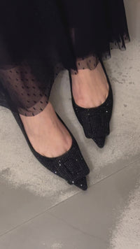 Ballerina senza tacco con strass neri tono su tono, a punta con dettaglio quadrato in punta.