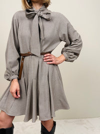 Abito in fantasia vichy nei toni del bianco, nero e tabacco. Chiusura con tre bottoni nella parte alta e fiocco, più stretto in vita e gonna svasata, cintura in pelle compresa.