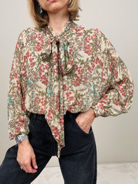 Camicia modello over, chiusura con fiocco, senza giromanica, polsino alto.