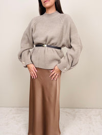 Gonna in satin color caramello. Vita alta con elastico. Vestibilità leggermente asciutta. Lunghezza alla caviglia.