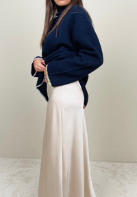 Gonna in satin avorio. Vita alta con elastico. Vestibilità leggermente asciutta. Lunghezza alla caviglia.