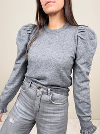 Maglioncino con spalla a sbuffo. Manica lunga con polsino con ruches. Lunghezza regolare.