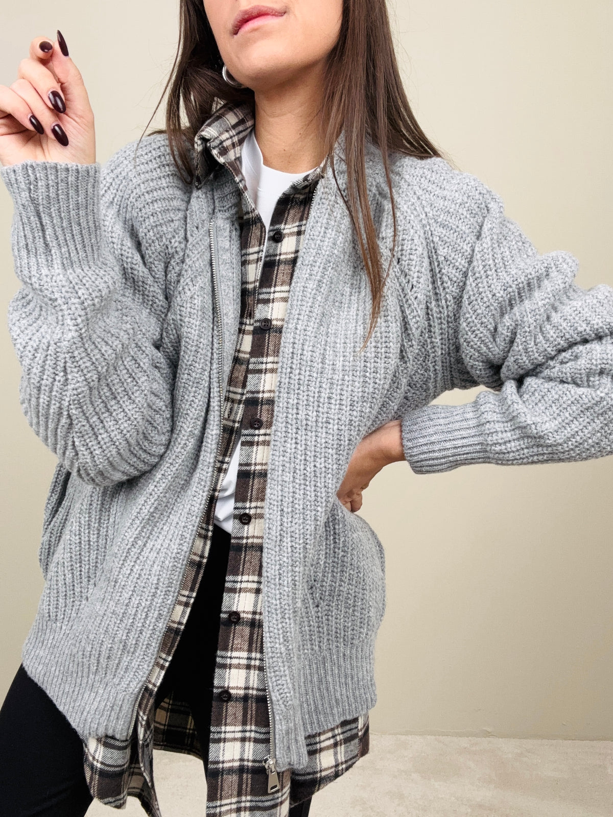 Bomber in maglia grigio. Chiusura con zip. Senza spalla. Manica leggermente morbida. Tasche laterali a scomparsa. Modello over.
