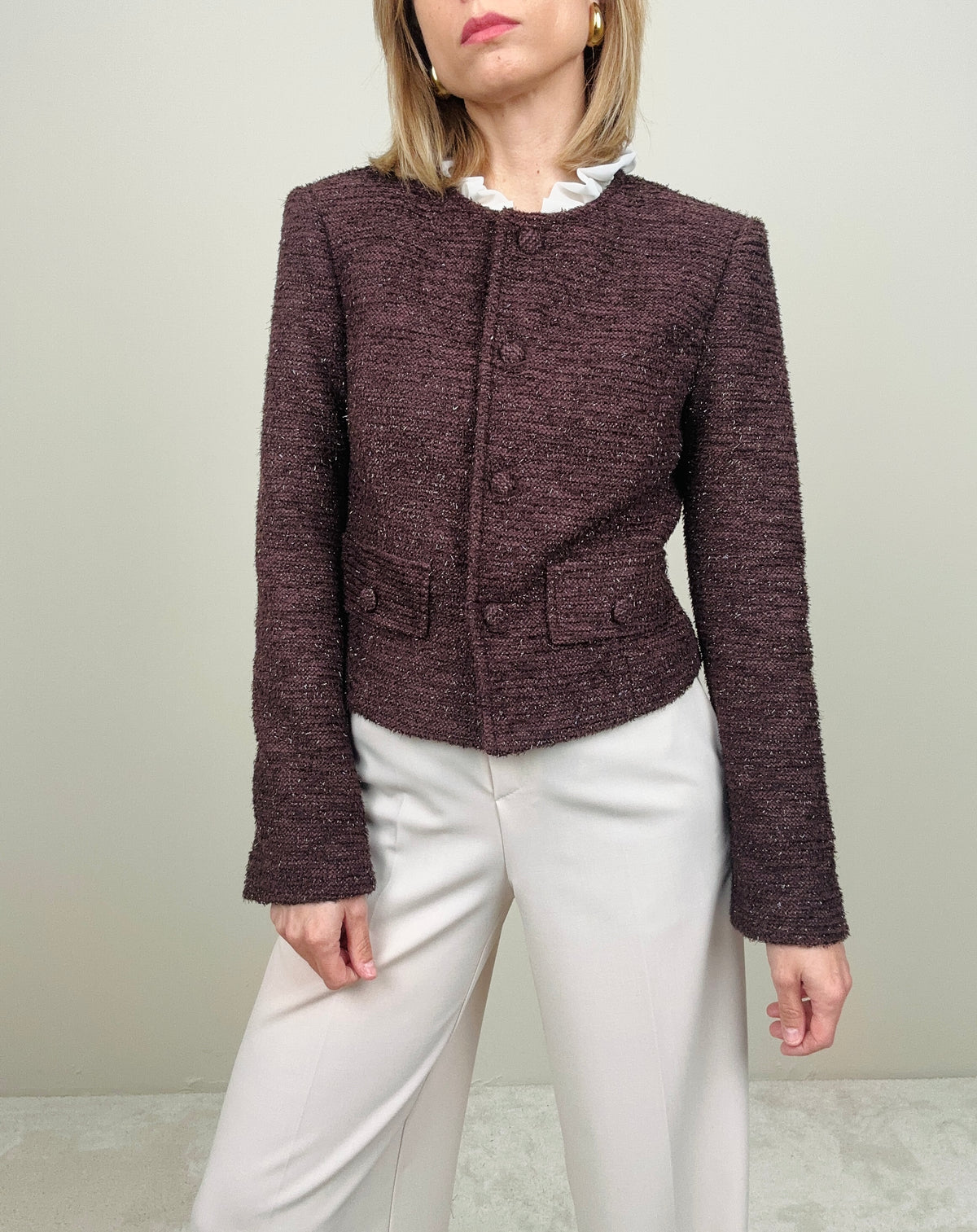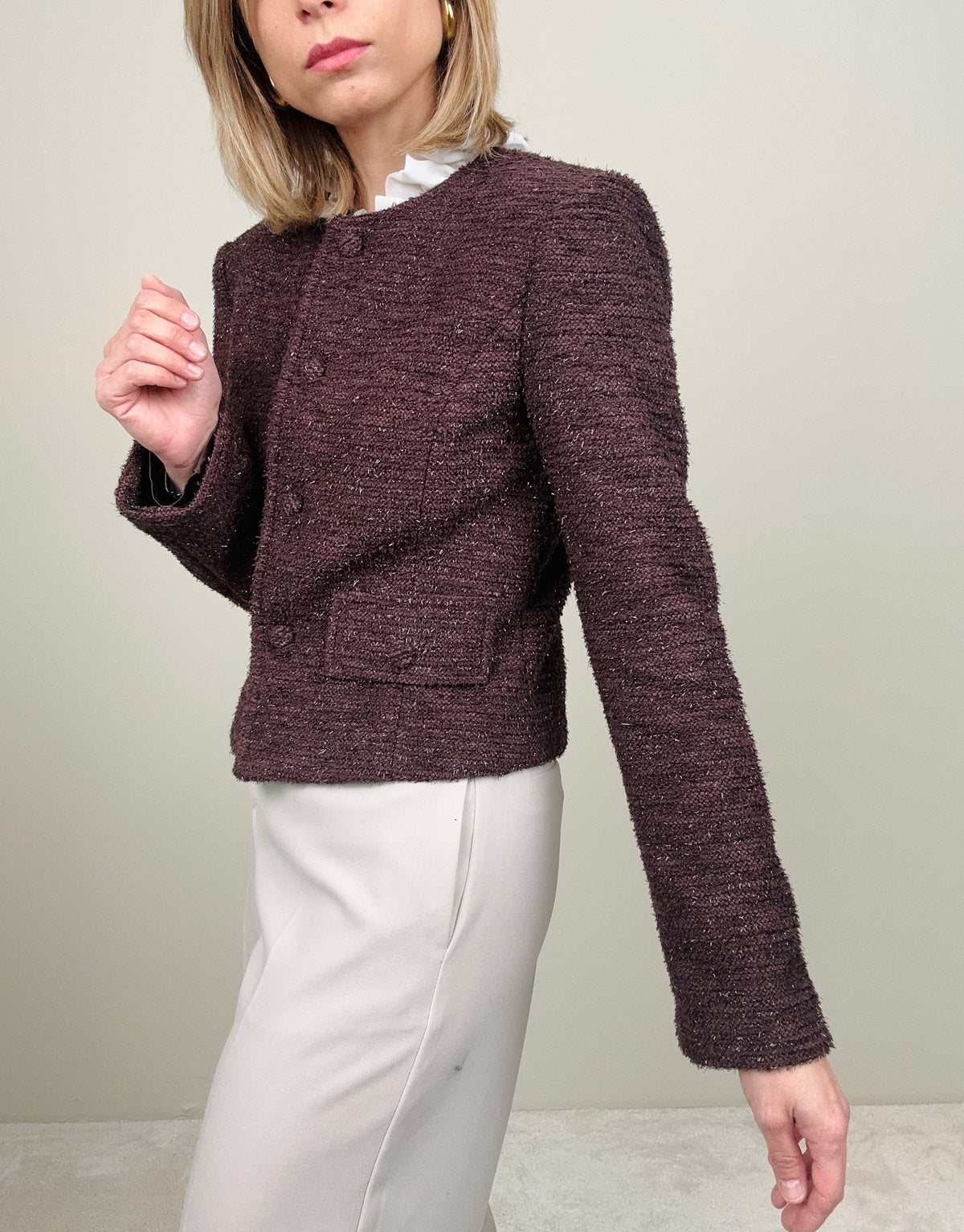 Giacchino modello chanel in tessuto con bottoni dello stesso tessuto. Vestibilità corta e sfiancata, sfoderata, manica e spalla regolari. Caratterizzato da colletto burro, removibile all’occorrenza.