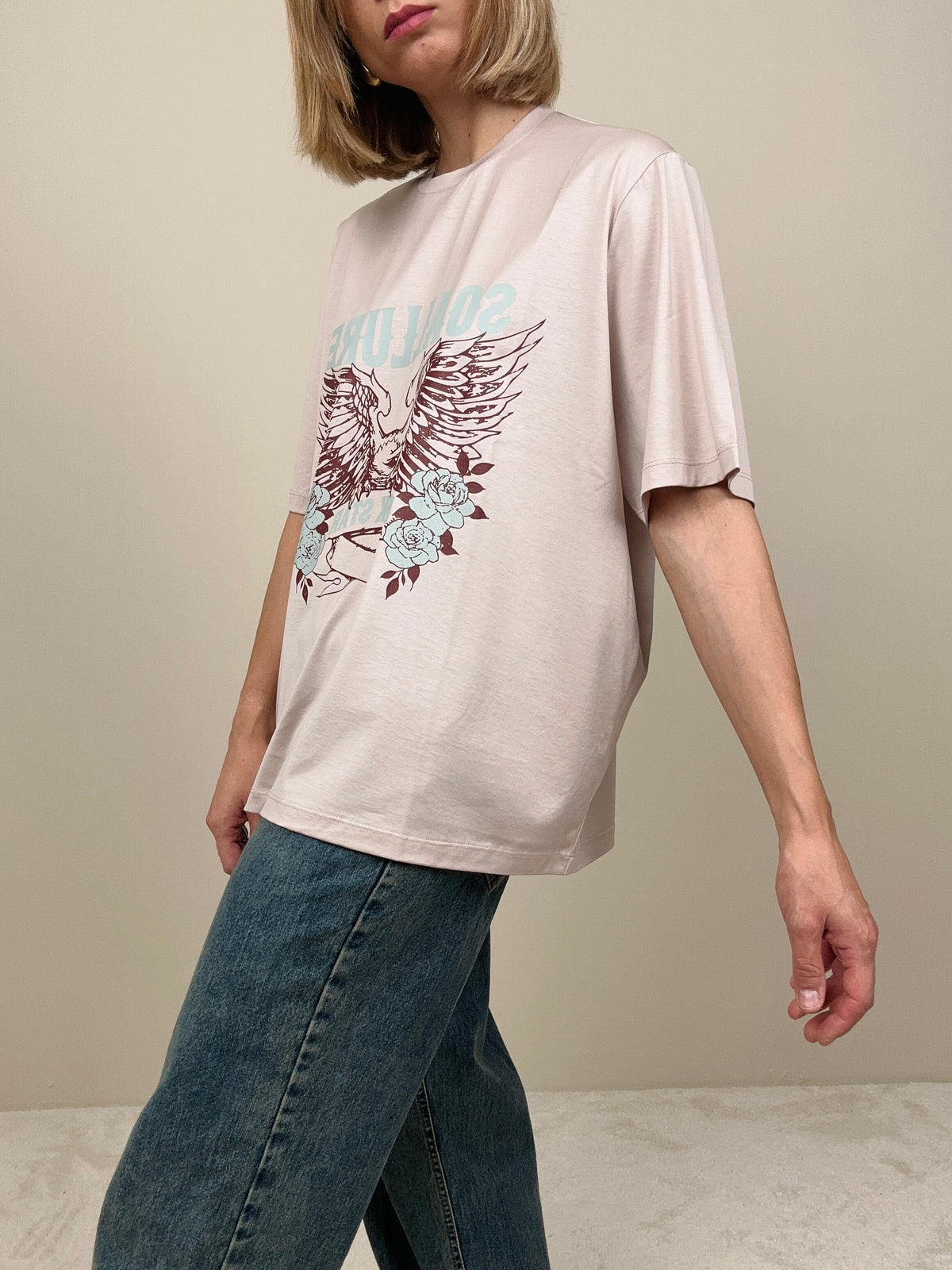 T-shirt dal tessuto morbidissimo, vestibilità over, fondo rosa cipria con disegno su tutta la parte frontale.